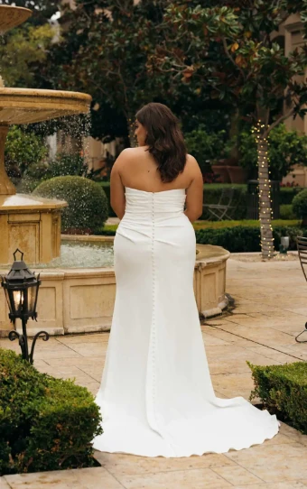 Wrapped in luxe liquid crepe, this chic ivory column gown exudes clean simplicity and contemporary sophistication. The strapless neckline naturally unfolds into a pleated and draped bodice that accentuates the natural silhouette. In the back, fabric-covered buttons form a timeless row from the top of the bodice to the edge of its sweeping train. A minimalist sheath skirt glides across the form like liquid to part at the front in a sexy side slit. Style D3634 is everything a modern bride could dream of. This wedding gown is also available in plus sizes.