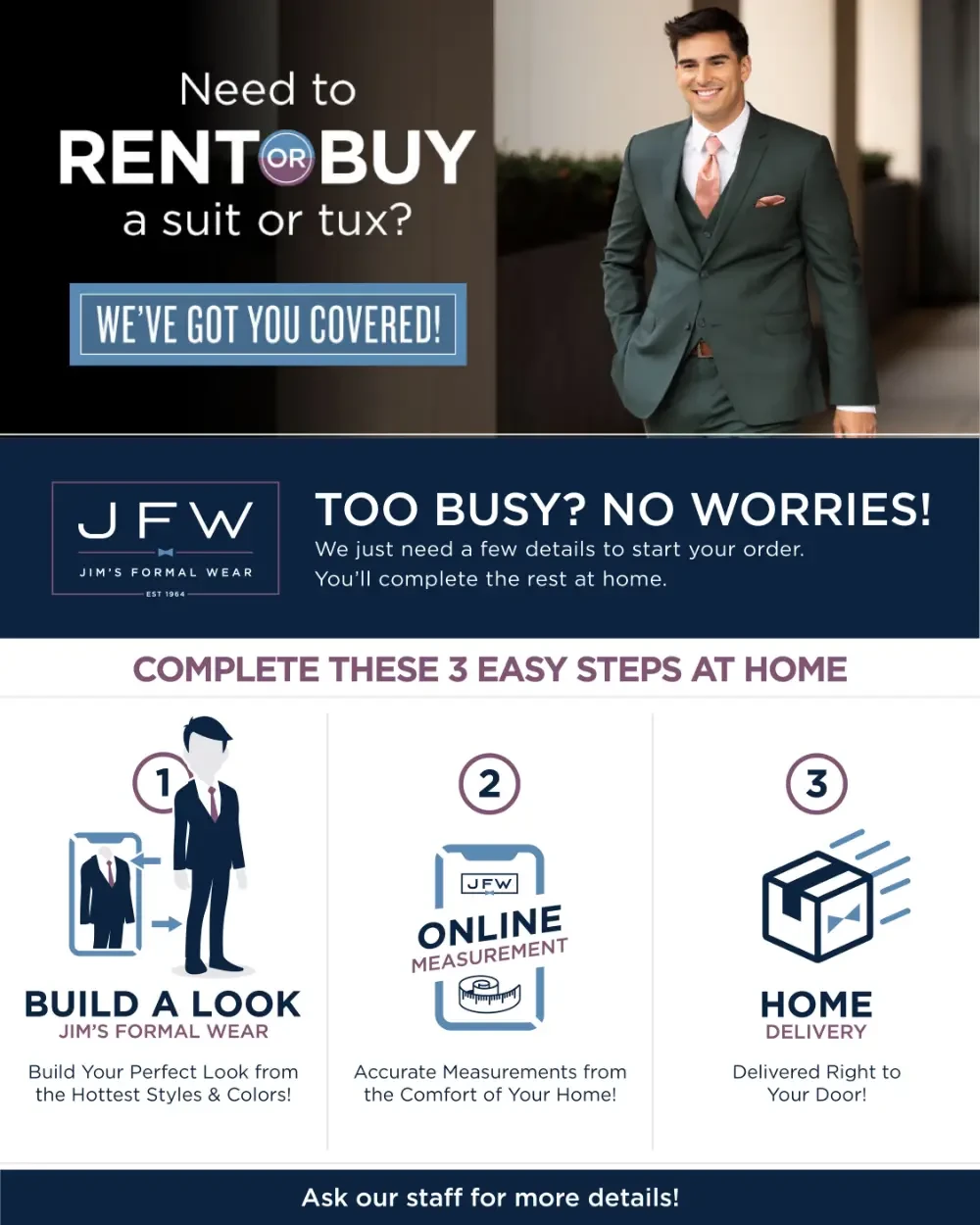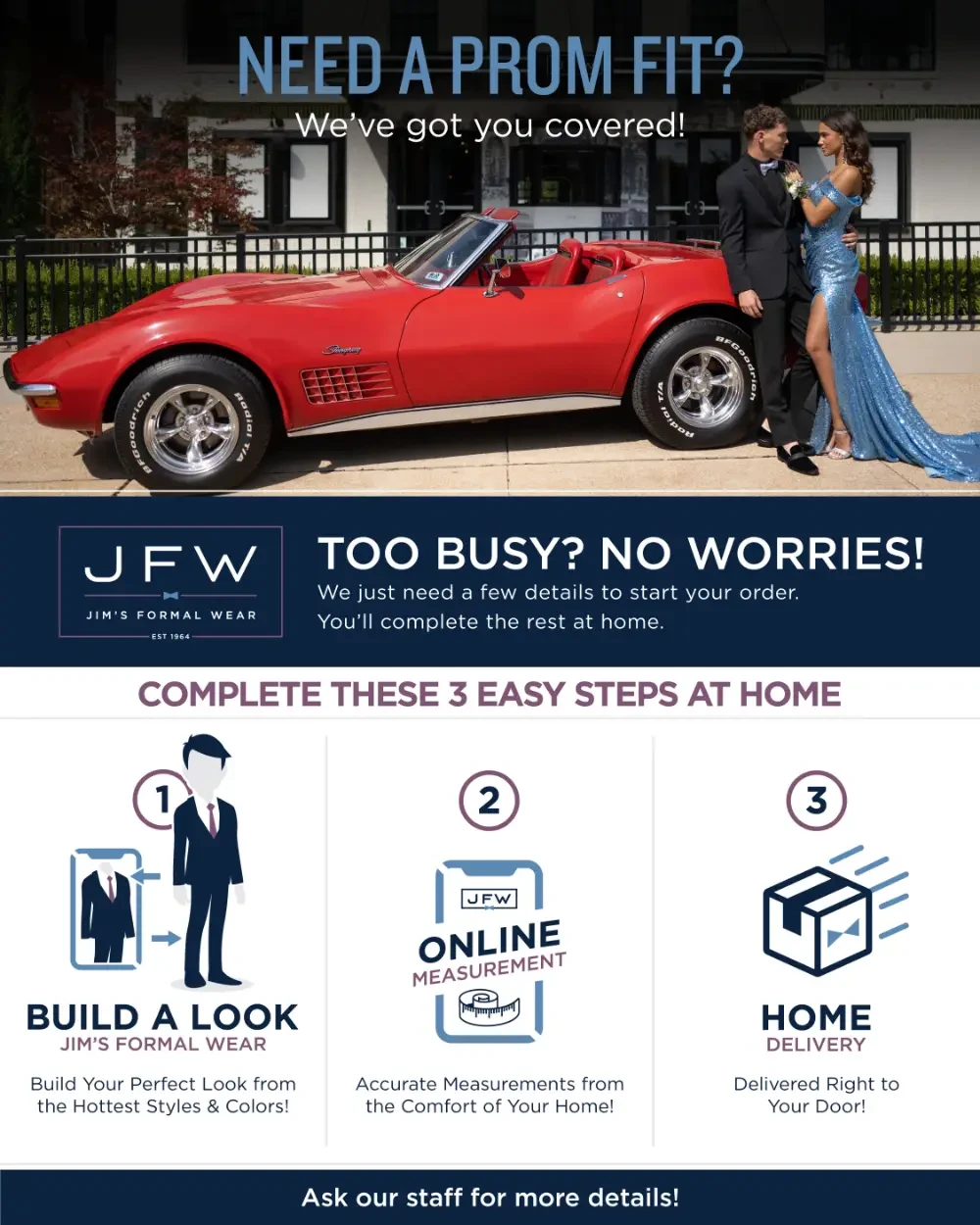 Prom & Special Events:● High-Quality Formalwear for Every Style – Our collection of suits and tuxedos blends timeless elegance with modern trends. Whether you're renting or buying, you can count on premium quality that will make you stand out. ● Effortless Prom Planning – Planning your prom should be about creating memories. Let us handle the formalwear with flexible rental and purchase options, offering a variety of looks that match your personal style. ● Convenience – Whether you prefer an in-person or virtual initial consultation, we make the process simple. Following your consultation, the process is completely online. We make it easy to rent or buy your perfect suit or tuxedo. |