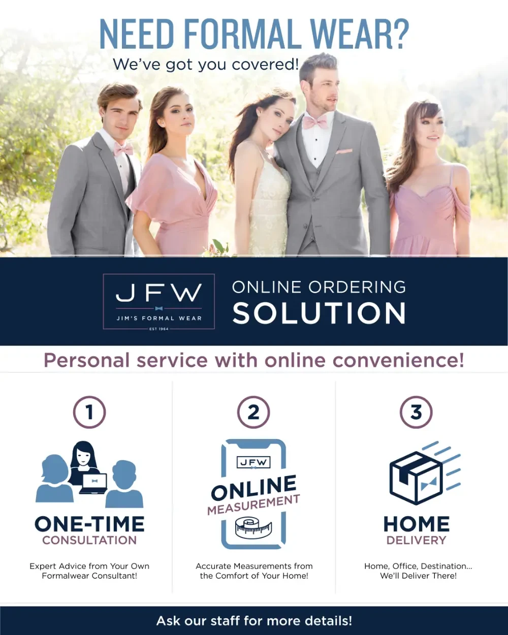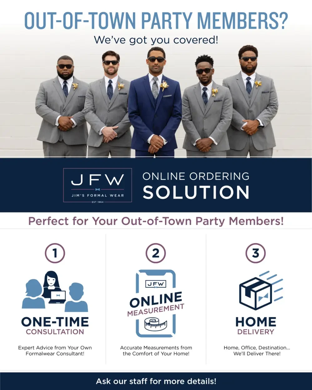 - The organizer (bride/groom) will receive contact information for Jim's Formalwear's Customer Service team should they have any questions about their event.